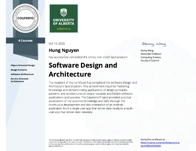 Hoàn thành Chuyên ngành Thiết kế và Kiến trúc Phần mềm (Software Design and Architecture Specialization). Nắm vững kiến thức và thể hiện khả năng áp dụng các nguyên tắc thiết kế, mẫu thiết kế (design patterns), và kiến trúc phần mềm để tạo ra các ứng dụng và hệ thống phần mềm có khả năng tái sử dụng và linh hoạt.